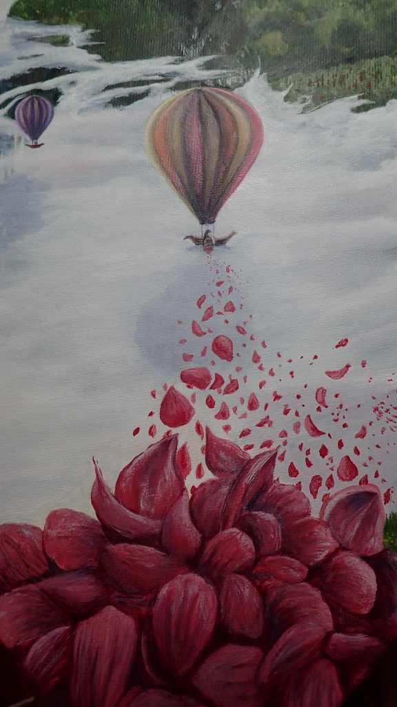 Surrealist dreamscape painting of hot air balloons throwing petals, with a pretty backdrop of Mont Blanc and Aiguilles de warrens in the French Alps. This is a commissioned piece.