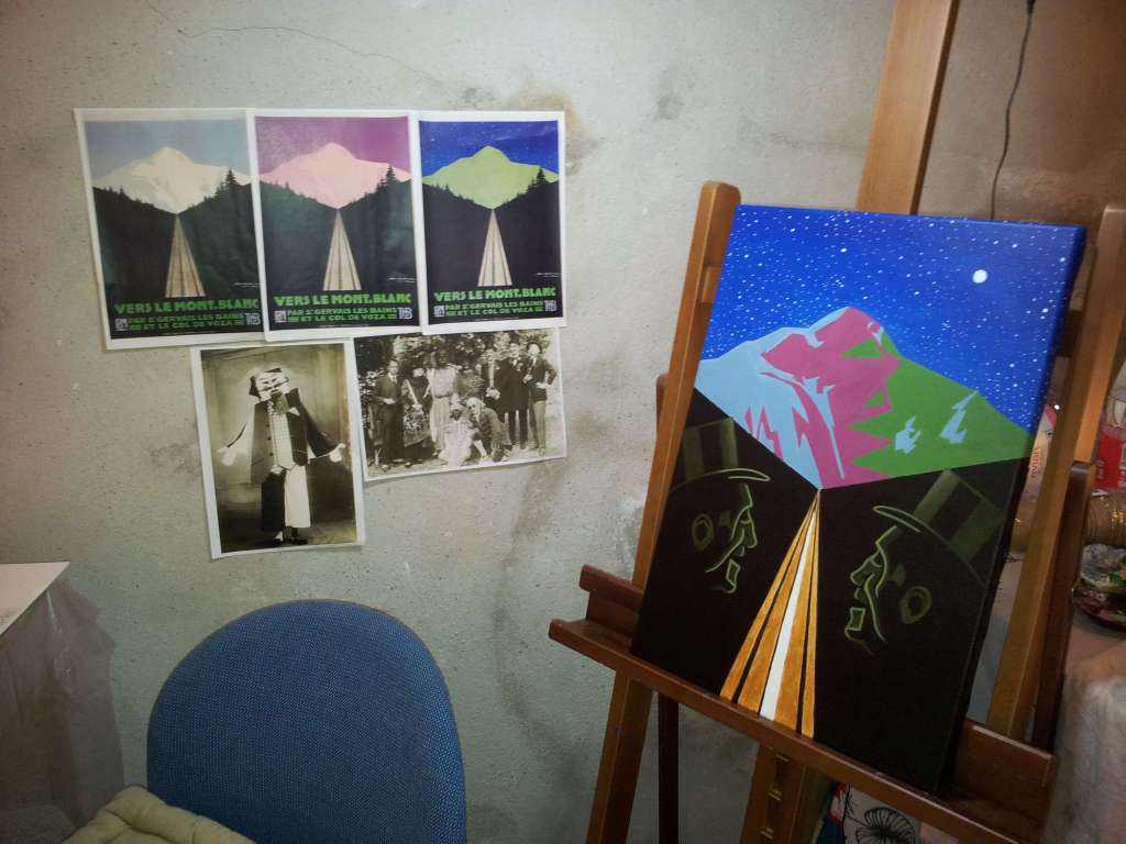 This tribute is a combination of his last three popular works, with the addition of Géo Dorival’s profile in the shadow. The rail has been gilded to symbolise the value of the region. The Cubist influence found in his work has been amplified in the way the colours of the mountain have been placed. Depending on the light and the position, Géo’s profile disappears to look more like Géo Dorival’s original work ‘Vers le Mont Blanc.’