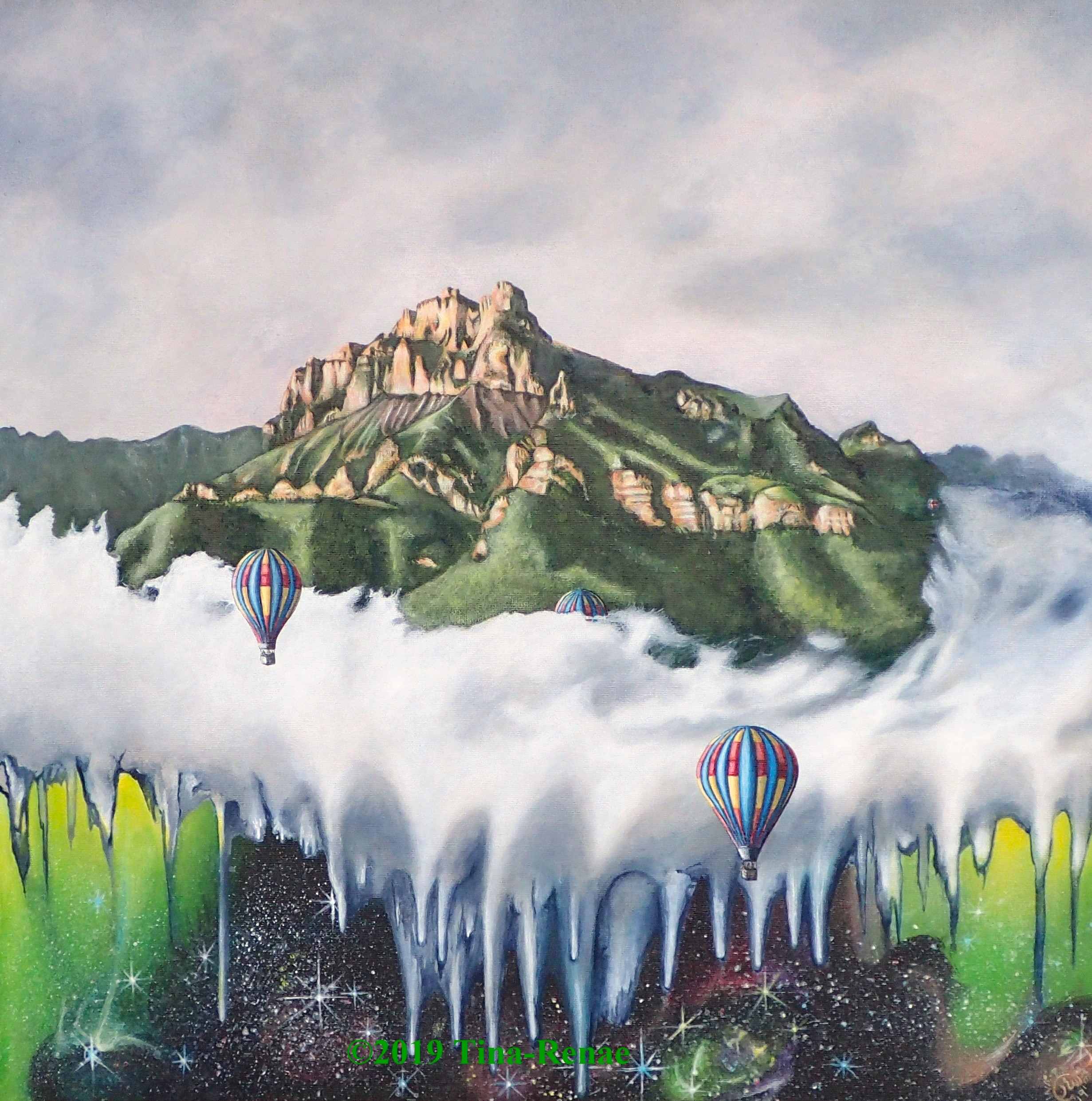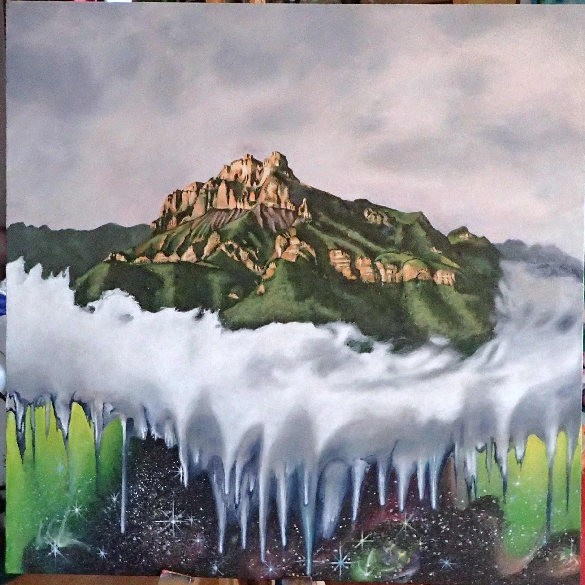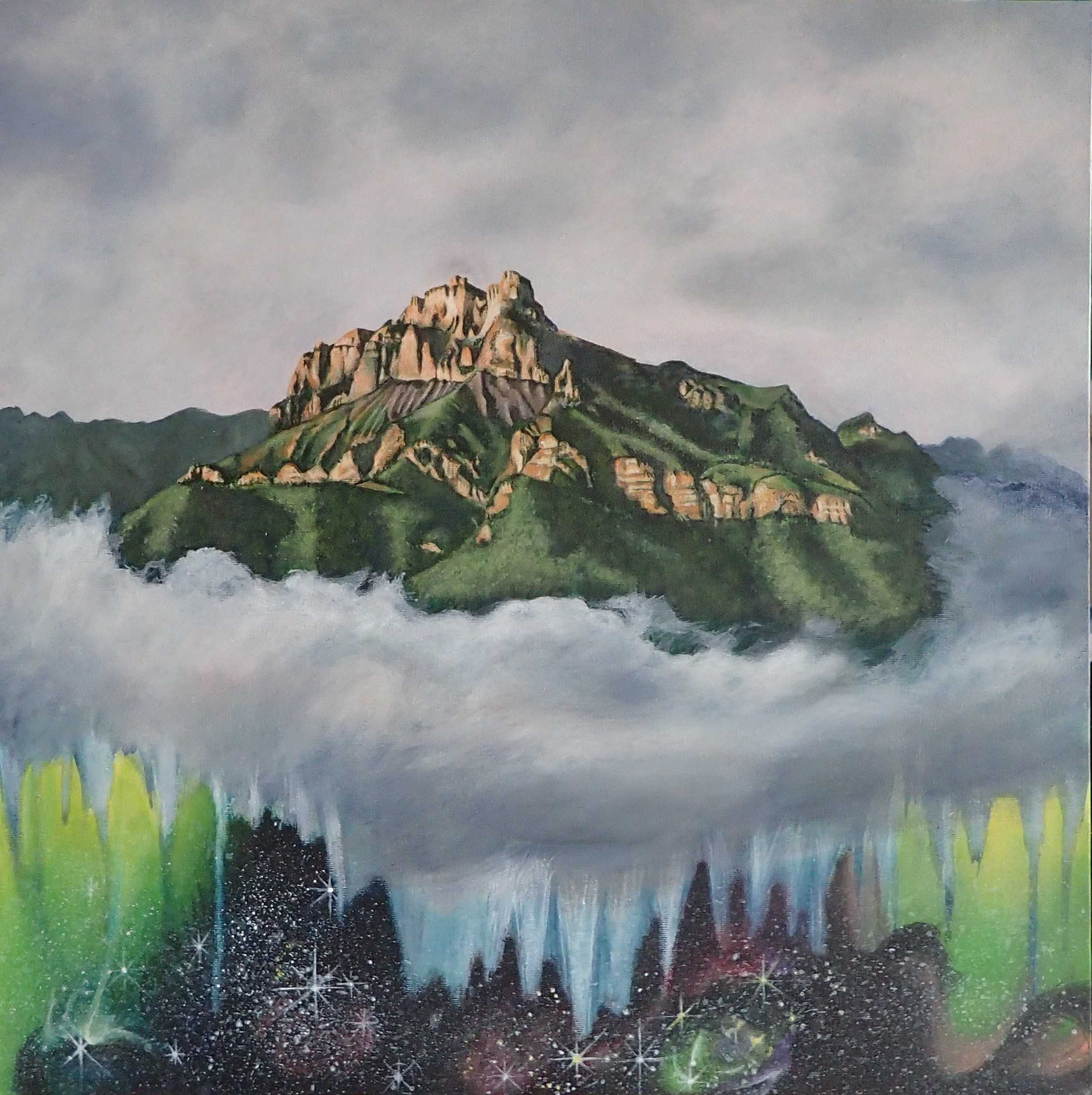 This mountain that I open my bedroom window to looks like a castle. The changes of colour, through the different seasons and time of day, are amazing. Sometimes the whole valley is hidden under a veil of clouds and hot air balloons can be seen regularly floating around the mountains. I add a universe underneath, for who knows what exists under there, when we cannot see under the veil?