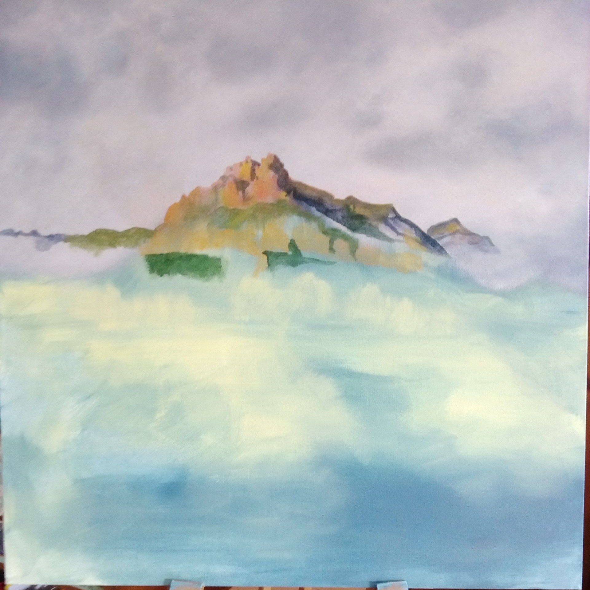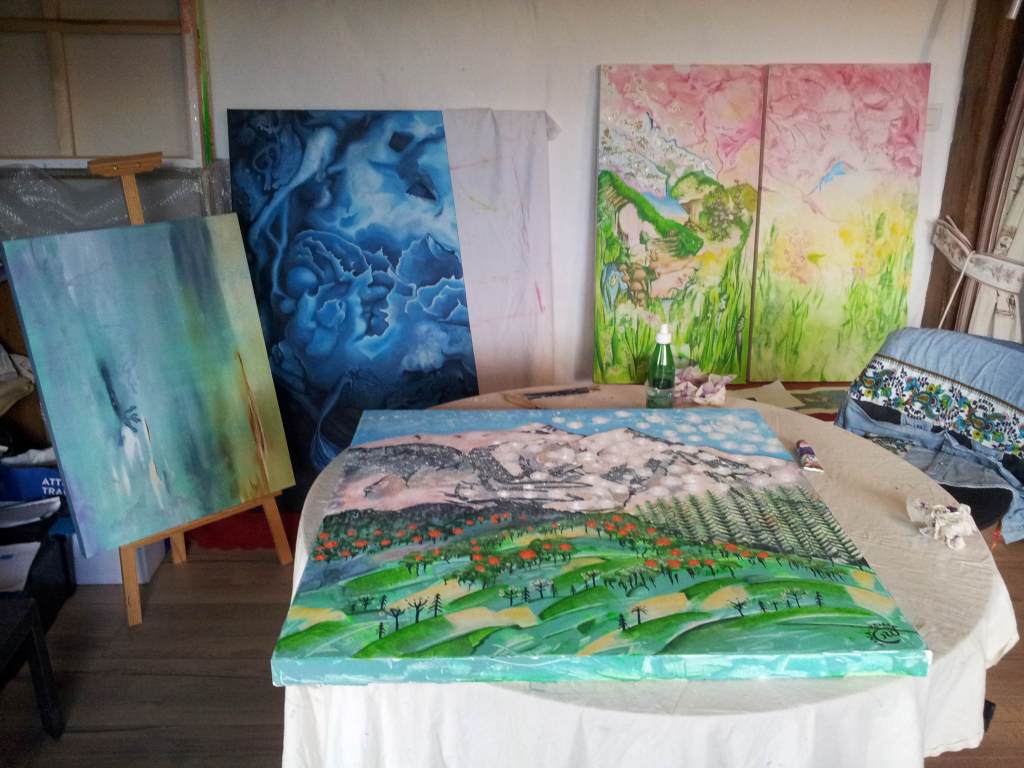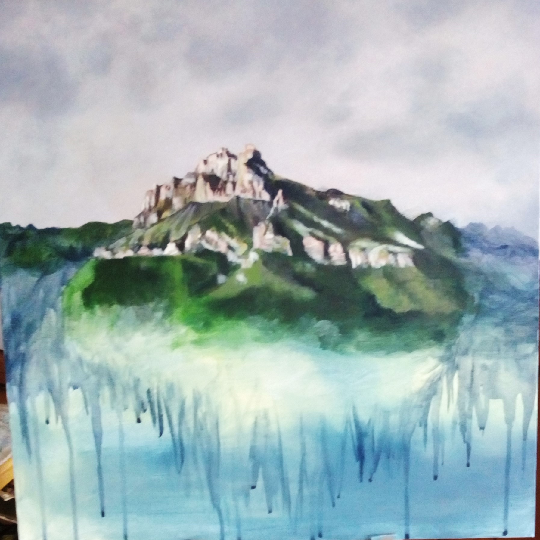 This mountain that I open my bedroom window to looks like a castle. The changes of colour, through the different seasons and time of day, are amazing. Sometimes the whole valley is hidden under a veil of clouds and hot air balloons can be seen regularly floating around the mountains. I add a universe underneath, for who knows what exists under there, when we cannot see under the veil?