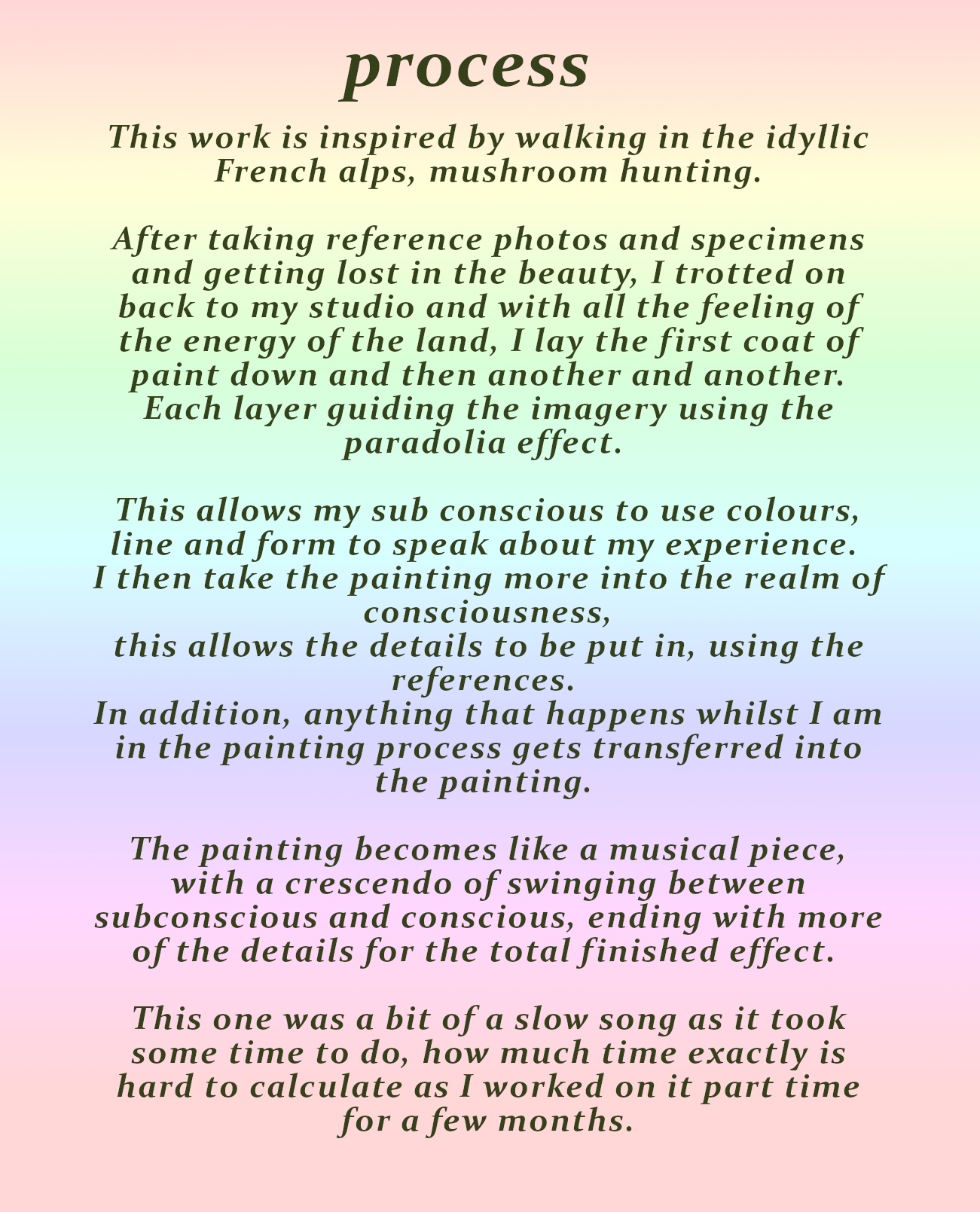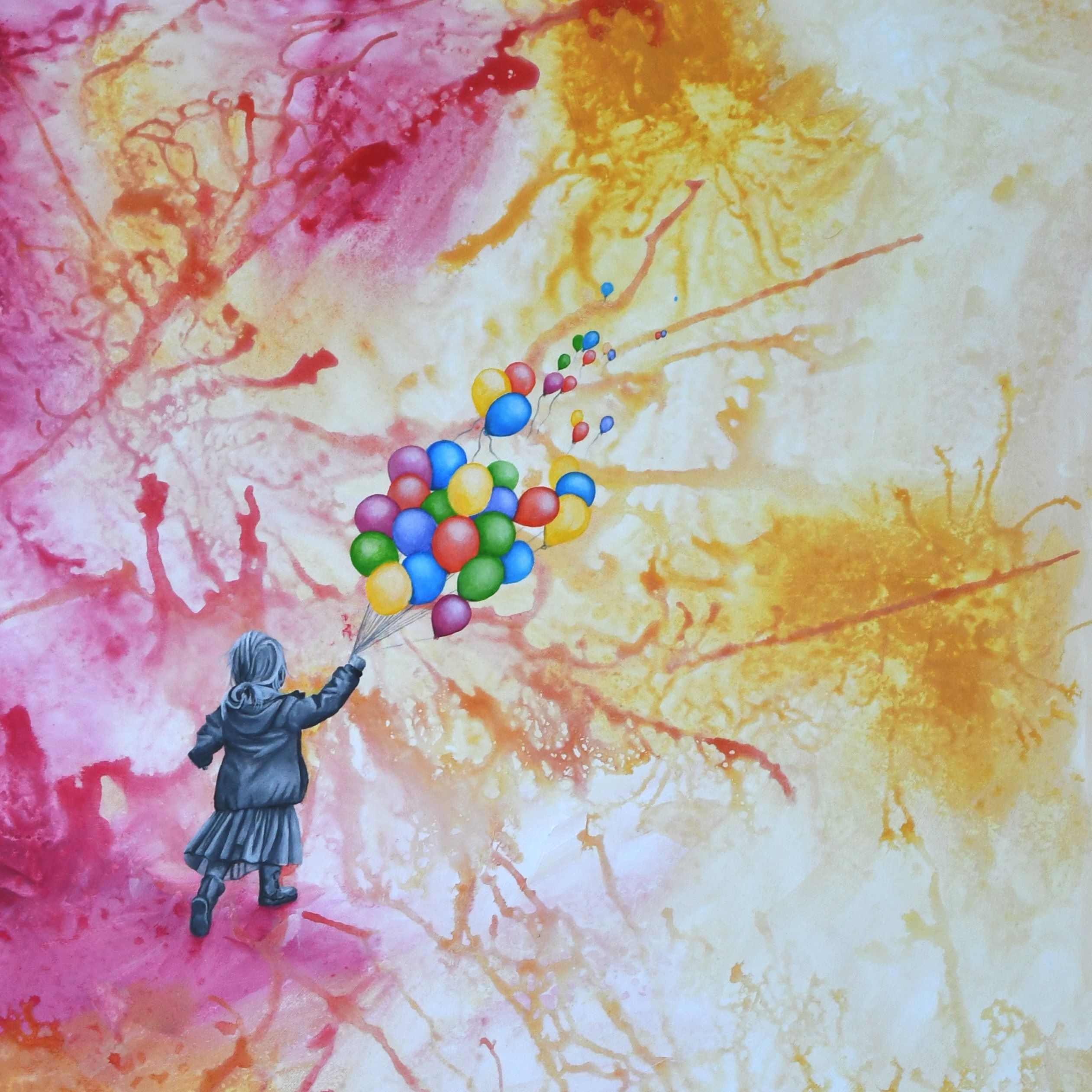 Flutter was inspired from a walk in the grassy fields of the French alps. From the memory of the grass and the afternoon light on the backdrop of mountains, I recreated the scene with pure imagination. On the bottom half of the painting is the raw version of the memory, painted in the sub-conscious language of colour, line and form. The burst of butterflies joins the two realities together.