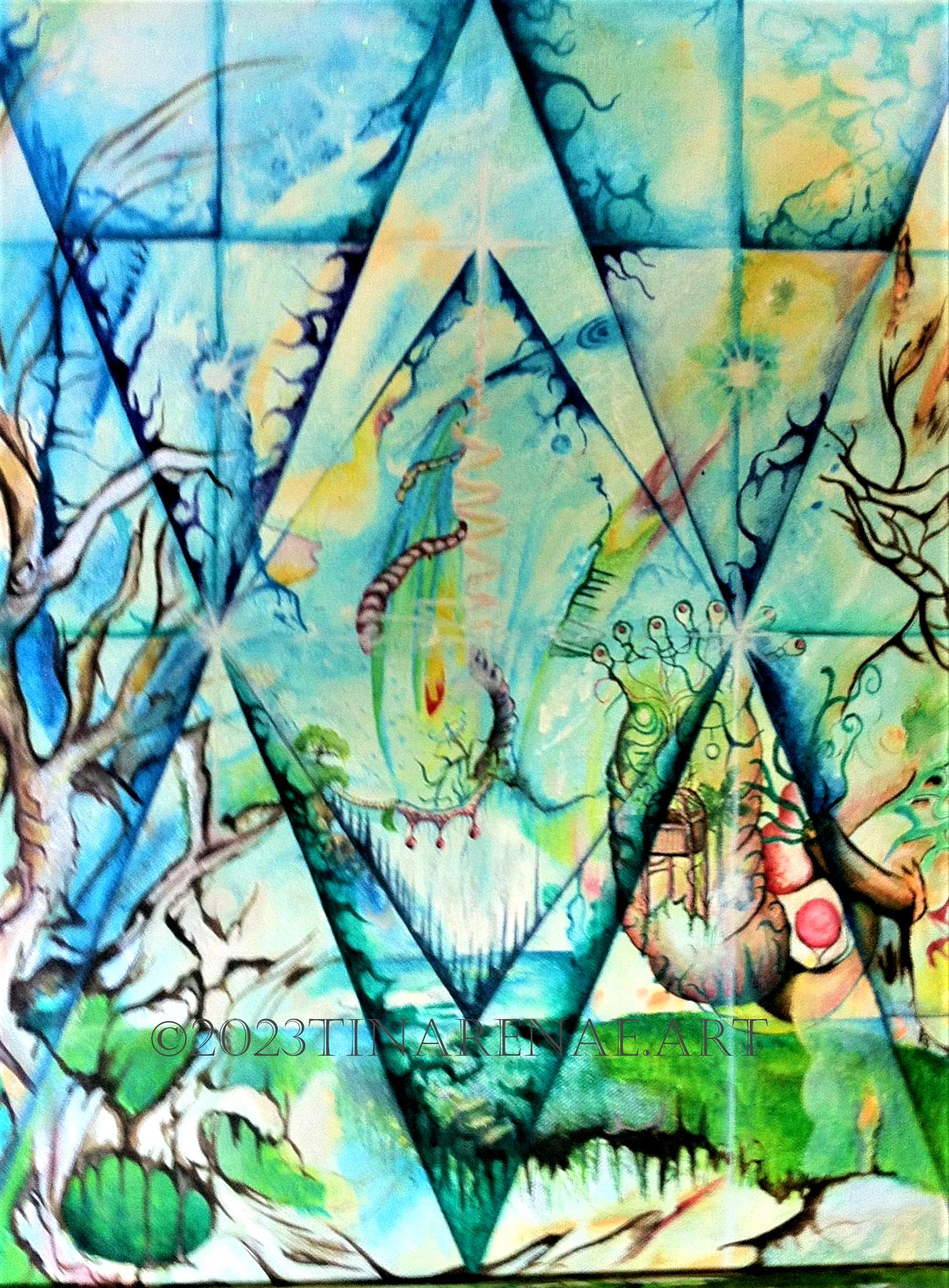In a world connected to our own, snippets of a different reality float in. This painting uses nonagons and the Fibonacci sequence to reference the mathematics of realities.