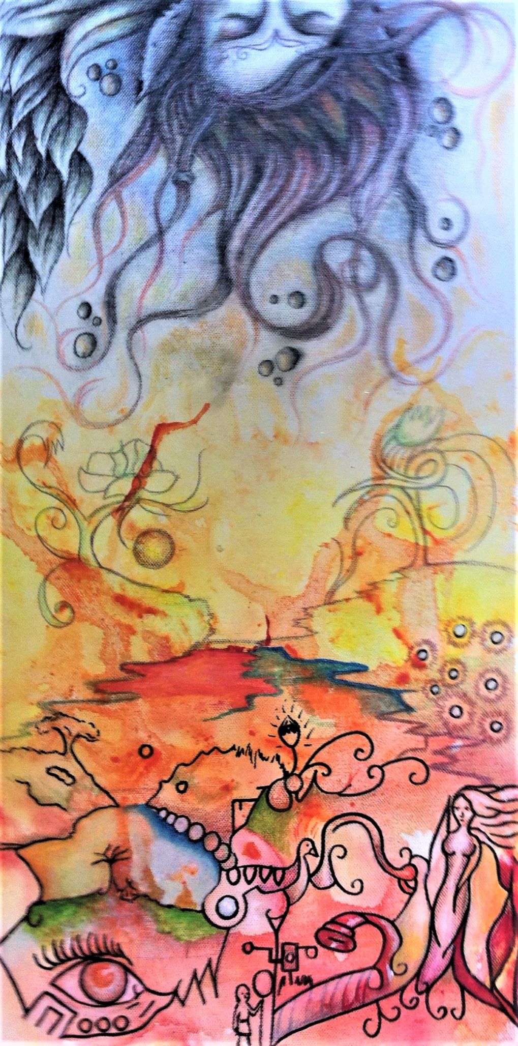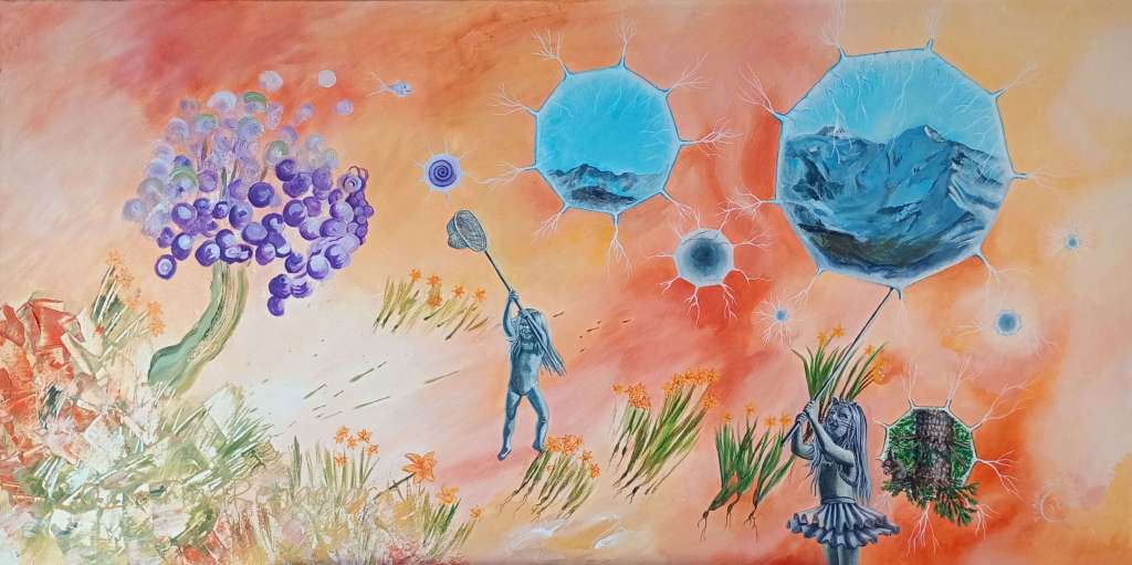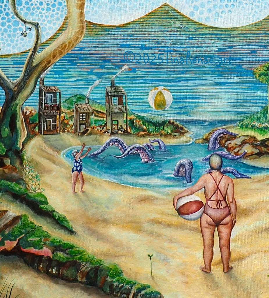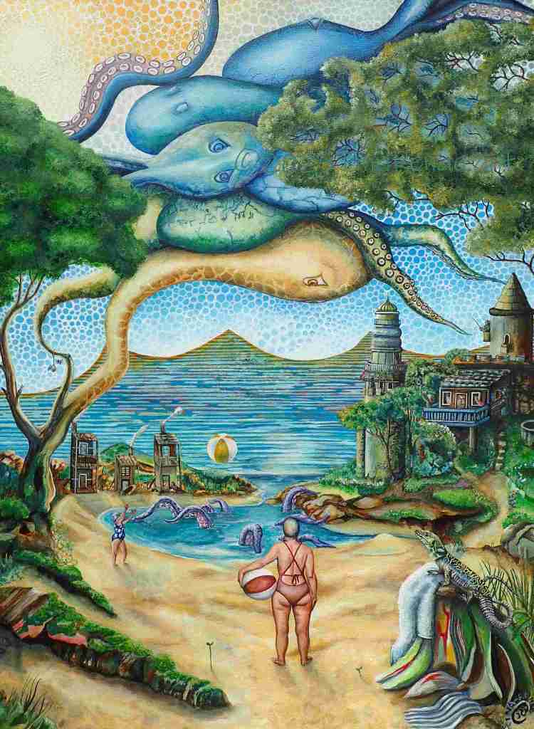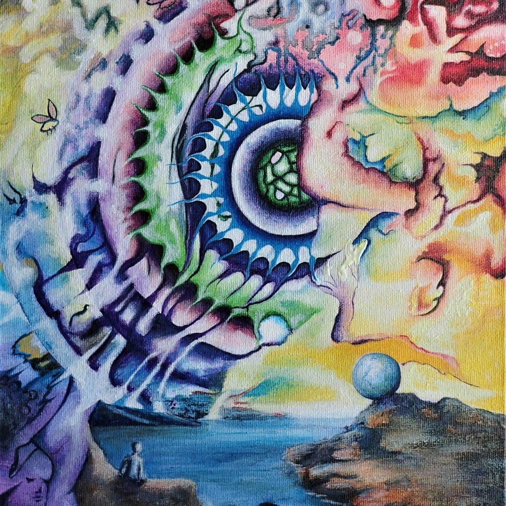 The painting called ‘Tic Toc’ has nothing to do with the social media platform, but everything to do with time. In particular, the space in-between the conscious and the sub-conscious. The colours, imagery and even the mindset through the painting process were all mindfully done to give the painting the energy needed to bring on a theta wave beat for the viewer. This is when you step out of your relative reality and take the watery path to other worlds that exist beyond ours. This is also one of the many paths to enter the subconscious, where all time exists at once or not at all, depending on the perspective. Travel light, there is no room for baggage.