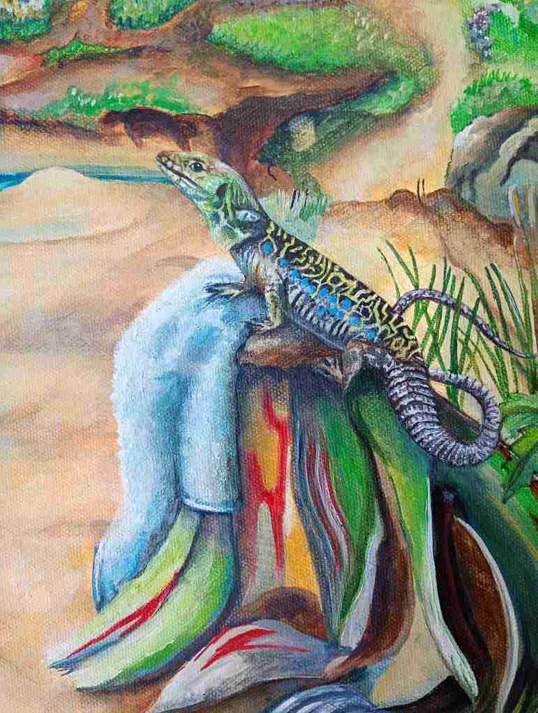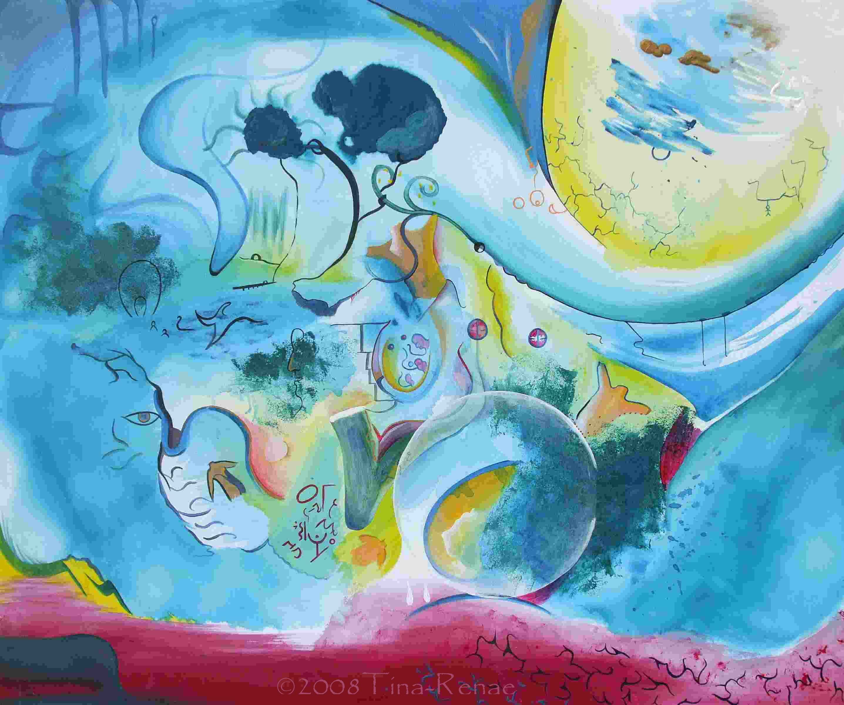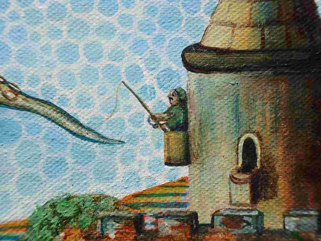 For this painting, I opened the door to outside influence and mixed some of my painting project ideas together. I also used coincidental influences such as shade on the painting to develop this strange world. Underlying this is a message about taking the strange things in life, in your stride and if things get weird…play ball.