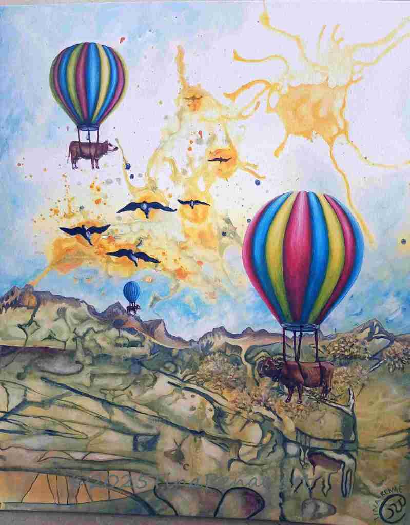 Surrealist dreamscape painting of hot air balloons carrying cows in the French Alps.